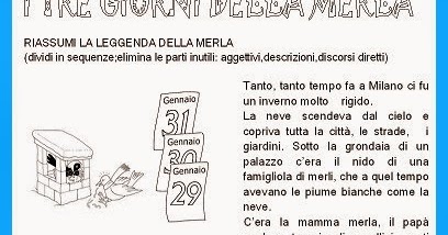 I giorni della merla tra storia e leggenda: Con l'espressione giorni della merla si identificano le tre giornate più fredde dell'anno che, secondo tradizione, cadrebbero il 29, 30 e 31 gennaio. Schede didattiche di storia per la scuola primaria classe prima. Per consuetudine, i giorni della merla sono gli ultimi tre giorni di gennaio (e in alcune zone anche il primo di febbraio) sono detti i giorni della merla. Se al contrario sono caldi, la primavera tarderà ad arrivare. Andava tutti i giorni a far legna2 nel bosco e vendeva la fascina per comprare il pane. Ci sono molte leggende regionali che spiegano il perché di questa.